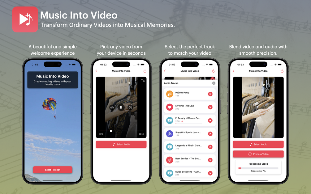 Music Into Video is a simple yet powerful app designed to help you bring your videos to life by effortlessly adding your favorite music tracks.